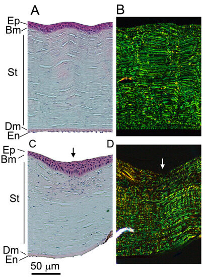H&E (A,C) and collagen-specific picrosirius red (B,D) staining of the uninjured (A,B) and injured (C,D) sites. Please note that panels (C,D) are representative images for the injured sites from the ACA-treated and Ctr groups. Epithelium (Ep), Bowman’s layer (Bm), stroma (St), Descemet’s membrane (Dm), endothelium (En), and the incision site (arrows) are indicated.