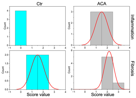 Histograms showing the distribution of scores for inflammation and fibrosis in the injury sites of the control (Ctr) and ACA-treated (ACA) groups.