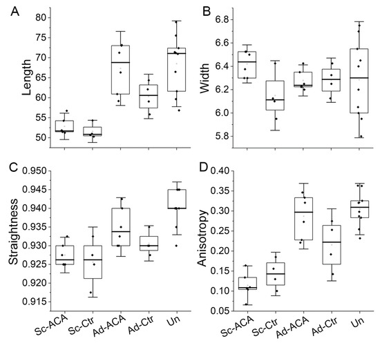 Box plots representing the length (A), width (B), straightness (C), and anisotropy (D) of the fibrils from the Sc-ACA, Sc-Ctr, Ad-ACA, Ad-Ctr, and Un sites. The interquartile range between the 25th and 75th percentiles determines each box. The lines within the boxes represent the medians, while the whiskers delineate the SD values.