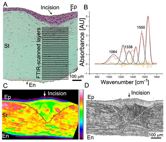 Utilizing FTIR spectroscopy, we measured the relative content of collagen in the injured and injury-adjoining sites (Figure 8A,C,D). Collected spectra were analyzed using curve fitting (Figure 8B).