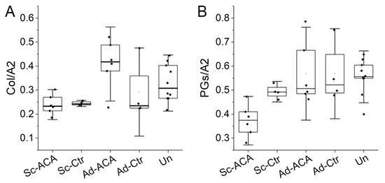 Box plots representing the relative collagen content (A) and the relative PG content (B) in the Sc-ACA, Sc-Ctr, Ad-ACA, Ad-Ctr, and Un sites. The relative collagen content was calculated as the ratio of the FTIR-based collagen-derived peak (Col, centered around 1338 cm−1) area and the amide II (A2)-derived peak (centered around 1550 cm−1) area. The relative PG content was calculated as the ratio of the FTIR-based PG-derived peak (centered around 1064 cm−1) area and amide II-derived peak area. The interquartile range between the 25th and 75th percentiles determines each box. The lines within the boxes represent the medians, while the whiskers delineate the SD values.
