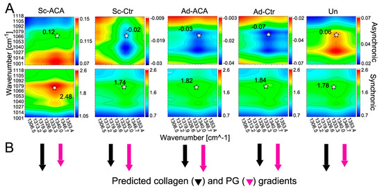 (A) Two-dimensional correlation FTIR spectroscopy (2DCS) asynchronous and synchronous maps showing the correlation values of the collagen and PG changes occurring along the stroma depth in the Sc-ACA, Sc-Ctr, Ad-ACA, Ad-Ctr, and Un cornea regions. Please note that crucial 2D correlation values at ν1/ν2 coordinates are indicated in each panel. These values are at the collagen-derived (ν1; centered around 1338 cm−1) and PG-derived (ν2; centered around 1064 cm−1) cross-peaks indicated by asterisks (*). (B) A graphic presentation of the stroma-depth-dependent collagen and PG changes. The arrows show whether stroma-depth-dependent changes in collagen and PG signals occur in the same or opposite directions. A longer arrow indicates that the changes it represents (e.g., in collagen) occur before those of an analyzed partner (e.g., in PGs).