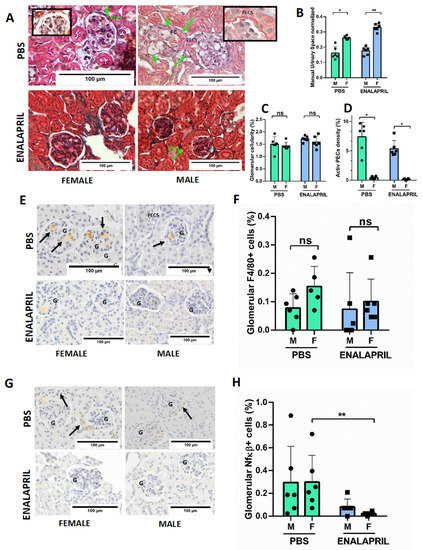 Glomerular injury was increased in male ApoE−/− mice. (A) Representative glomerulus (G) from females (left) or males (right). Green arrows indicate urinary space (upper), while foam cells, and parietal epithelial cells are shown by letters (FC and PECS, respectively). The window in the right-upper panel shows activated PECs. (B) Quantification of the urinary space in 15 glomeruli from each mouse with ImageJ2 v 2.9.0/1.53t (n = 6 male; n = 6 female) showing its reduction in males. Scale bar = 100 μm. (C) Quantification of mean mesangial cellularity showed no sex-associated differences or according to the enalapril treatment. (D) Quantification of activated PECs in glomeruli showed their increase in males. (E) Representative glomerulus showing macrophages as F4/80+ cells (black arrows). (F) Quantification of total macrophage (F4/80+ cells) infiltration. (G) Representative glomerulus showing NF-κB+ cells (black arrows). (H) Quantification of NF-κB+ cells. Kruskal-Wallis was performed for statistical analyses; * p < 0.01; ** p < 0.0001. Abbreviations: G: Glomerulus; PECs: parietal epithelial cells; FC: foam cells, M: Male; F: female; PBS: phosphate-buffered saline; ns = nonsignificant.