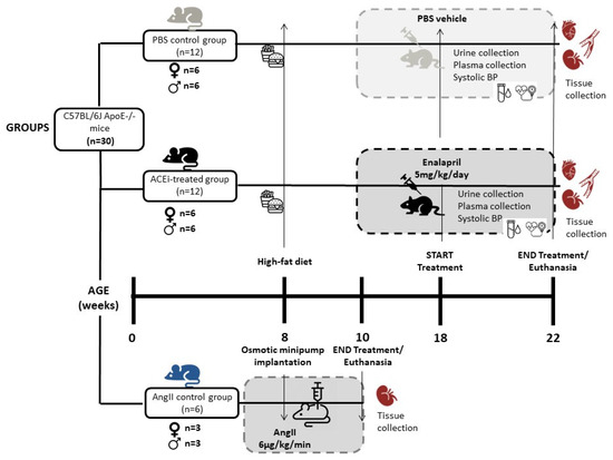 Experiments were performed in 8-week-old ApoE−/− mice on C57BL/6 background (12 males and 12 females; Jackson Laboratories, Bar Harbor, ME, USA), fed for 10 weeks with a high-fat rodent diet that contained 1.25% cholesterol and provided 40% of the energy as fat (D12108CI; Research Diets Inc., New Brunswick, NJ, USA). The design of the study is summarized in Figure 4. Mice were randomized into three different groups: (i) an enalapril group (n = 12; 5 mg/kg/day enalapril dissolved in PBS and administered subcutaneously, (ii) a group treated with Ang II (n = 6; 6 μg/kg/min Ang II for 2 weeks) delivered through a subcutaneously implanted osmotic minipump (Model 1002 Micro-Osmotic Pump Alzet, Durect Corporation, Cupertino, CA, USA) with a pumping rate of 0.25 uL/h in order to identify renal lesions caused by Ang2, and (iii) a control group treated with the vehicle PBS for an additional period of 4 weeks (n = 12). Animals were euthanized at 22 weeks of age by inhalation of <5% isoflurane and cardiac puncture. Next, the vascular tree was perfused with PBS under physiological pressures, and aortas and kidneys were removed, and fixed with 4% paraformaldehyde during 12 h for aortas or with 10% buffered formalin during 2 days for kidneys. All animal studies were carried out in accordance with recommendations in the Guide for the care and use of Laboratory Animals of the National Institutes of Health. The protocol was approved by the Committee on the Ethics of Animal Experiments of UB-Bellvitge (number 85/20).