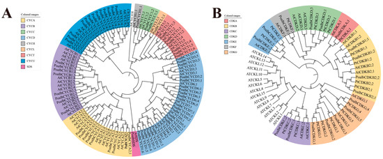 After multiple alignments using the MAFFT website (https://mafft.cbrc.jp/alignment/server/, accessed on 2 March 2022), 63 cyclin protein sequences in P. alba and 49 cyclin members in A. thaliana were used to calculate the parameters in phylogenetic analysis via Modelgenerator software [64]. These parameters were used in the PhyML program to build trees according to the maximum likelihood (ML) method with 1000 bootstrap replicates [65]. The final phylogenetic tree was modified by iTOL website (https://itol.embl.de/itol.cgi, accessed on 20 March 2022). The 17 CDK sequences in P. alba, 18 CDK sequences in P. trichocarpa, 14 CDK sequences and 15 CKL sequences in A. thaliana shared the same operations.