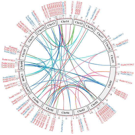 Duplicated genes in plants were attributed to ancient duplication events [25]. Consequently, DupGen_finder software was employed to find out the duplicated cyclin and CDK gene pairs in P. alba (Table S4). The colorful lines in circos figure represented the duplicated cyclin and CDK gene pairs (Figure 2). There were 48 cyclin duplicated gene pairs and 11 CDK duplicated gene pairs, and most of them were involved in WGD events. Additionally, the duplication type of three cyclin gene pairs (PoalbCYCA3;2/PoalbCYCA3;3, PoalbCYCC1;1/PoalbCYCT1;4, PoalbCYCC1;2/PoalbCYCT1;4) were regarded as transposed duplication, while only one cyclin duplicated gene pair (PoalbCYCU4;1/PoalbCYCU4;2) was considered as proximal type genes. Moreover, 4 of 11 CDK duplicated gene pairs (PoalbCDKA;1/PoalbCDKB1;2, PoalbCDKC;1/PoalbCDKC;2, PoalbCDKD;1/PoalbCDKD;3, PoalbCDKG;1/PoalbCDKG;3) were identified as transposed type genes. However, tandem duplication was not found in cyclin and CDK genes in P. alba. All this evidence illustrated that whole genome duplication (WGD) was the main way that resulted in the expansion of cyclin and CDK genes in P. alba. Furthermore, transposed, and proximal duplication also played important roles during the evolution. Interestingly, each of the five CYCD3 genes in P. alba was collinear with the other four genes.