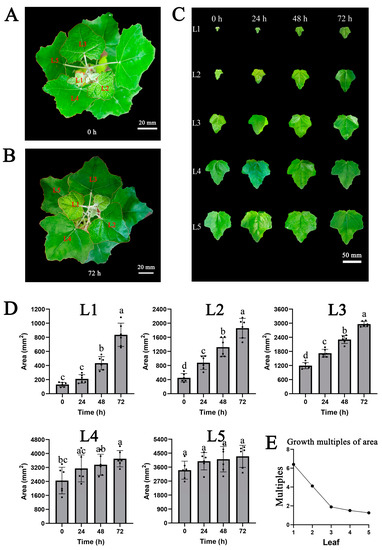 The growth curve of leaf area from young leaves to mature leaves. (A) The seeding at 0 h. Bar = 20 mm. (B) The seeding at 72 h. Bar = 20 mm. (C) The leaves variation under auxin stimulation lasting for three days. The leaves were individually photographed and compiled for comparison. The first to the fifth rows were the first to the fifth leaf variation, respectively. The first to the fourth columns were the photos taken at 0 h, 24 h, 48 h and 72 h, respectively. The leaves were picked at 72 h. Bar = 50 mm. (D) Histogram of leaves area variation. The dots represented the individual leaves area. The error bars indicated standard deviation (SD). Different lower-case letter (a–d) indicated significant difference using ANOVA by Tukey test (p < 0.05). The L1-L5 represented the first to the fifth leaf, respectively. (E) The growth multiples of area. Within 72 h, the growth multiples from the first leaf to the fifth leaf area were 6.40, 4.11, 1.89, 1.51 and 1.26, respectively.