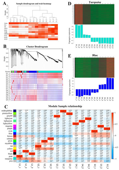 We used the TPM expression of all genes to construct a co-expression network, and combined this with the leaf area and the contents of multiple hormones. In the sample clustering tree, the differences from the first leaf to the fifth leaf gradually became larger (Figure 4A). Moreover, most hormones were distributed differently in various samples. After calculating the soft threshold, we constructed the co-expression network and modules by a one-step method. The module to which a gene belongs was determined by the absolute value of the eigengene connectivity (Table S12). Nearly 31,000 genes were divided into 20 modules (Figure 4B and Table S13). Turquoise module was the largest module with 15,906 genes, followed by the blue module with 5602 genes. The gene numbers of the most modules were basically maintained in hundreds. According to the correlation diagram between modules and samples, the turquoise module was generally positively correlated in the three samples of L1 with a correlation coefficient of 0.48 and a p-value of 0.07, but negatively correlated in the six samples of L4 and L5, with a correlation coefficient of −0.22. The blue module showed the contrary situation. It represented the negative correlation in six samples of L1 and L2 with an approximate correlation coefficient of −0.24, but the positive correlation in three samples of L5 with a correlation coefficient of 0.43 and a p-value of 0.1. Because the three biological replicates showed the high similarities in PCoA analysis, some modules that could not be correlated with all three biological replicates would not be considered. In the gene expression diagram of modules in samples, obviously, the genes expression level of the turquoise module was decreased gradually from L1 to L5, while the blue module was opposite to turquoise module (Figure 4D,E). Therefore, all this evidence manifested that the turquoise module was positively correlated with leaf development, while the blue module was negatively correlated with it.