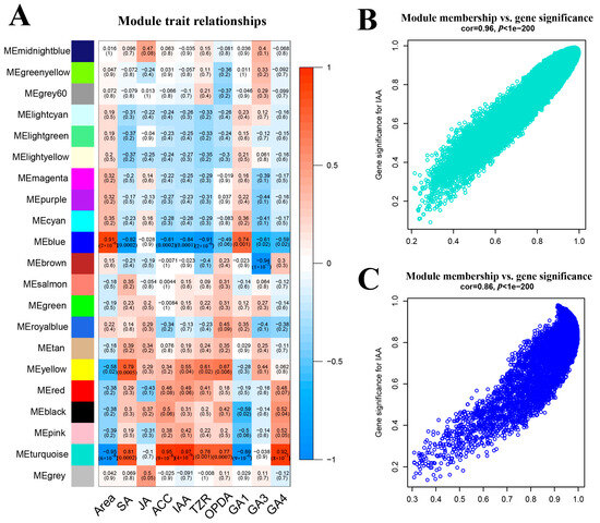 Relationships between modules and hormones. (A) Relationships between modules and traits. The color key from red to blue represent values from 1 to −1. Within each box, the number above represents the correlation coefficient, while the number below represents the p-value. (B) Turquoise module relationship with IAA. The coefficient of correlation was 0.96 with p-value of 1 × 10−200. (C) Blue module relationship with IAA. The coefficient of correlation is 0.86 with a p-value of 1 × 10−200.
