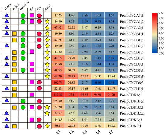 Predicted interaction network of high confidence was constructed via the STRING online tool (Figure S4). It was obviously that PoalbCDKA;1 was in the center of the network, which might directly interact with A, B, H, D, U and SDS-type cyclins. PoalbCYCH1;1 might interact with PoalbCDKD and PoalbCDKF. PoalbCDKB2;2 might interact with PoalbCYCA and PoalbCYCB. Interestingly, PoalbCDKC and PoalbCYCT were isolated from the large network and formed a tiny system.