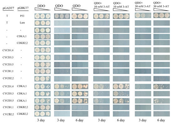 Previous studies found that CDKA could interact with CYCD to promote the G1-to-S phase, while CDKB-CYCB complex could activate the G2-to-M phase [35]. On the premise of co-expression and the auxin response cis-acting element (Figure 6), the PoalbCDKA;1-PoalbCYCD1;4, PoalbCDKA;1-PoalbCYCD3;3, PoalbCDKA;1-PoalbCYCD3;5, PoalbCDKB2;2-PoalbCYCB1;1 and PoalbCDKB2;2-PoalbCYCB2;2 were selected to identify their interactions by Y2H (Figure 7). As a HIS3 inhibitor, 3-AT was added to the medium. During the 6 days observation, PoalbCDKA;1-PoalbCYCD1;4, PoalbCDKA;1-PoalbCYCD3;3 and PoalbCDKA;1-PoalbCYCD3;5 could grow on the DDO, QDO, QDO + 10 mM 3-AT and QDO + 30 mM 3-AT medium, while PoalbCDKB2;2-PoalbCYCB1;1 and PoalbCDKB2;2-PoalbCYCB2;2 failed to develop. The growth condition on the QDO + 3-AT medium revealed that the interaction strength of the PoalbCDKA;1 with PoalbCYCD had the following relationships: PoalbCYCD1;4 > PoalbCYCD3;5 > PoalbCYCD3;3.