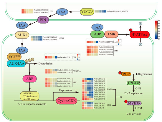 After being treated with IBA, the genes related to the cell wall, including xyloglucan endotransglucosylase (Poalb10G008630.1) and pectinesterase inhibitors (Poalb03G009440.1 and Poalb15G002730.1), were all upregulated. The elevated expressions of histone acetyltransferase (Poalb07G001710.1) with a 2.0-fold change and growth regulatory factor (GRF) (Poalb18G000510.1) with a 3.7-fold change were discovered. The expressions of Auxin-Regulated Gene involved in Organ Size (ARGOS) (Poalb07G002120.1), mitogen-activated protein kinase (MAPK) (Poalb01G024420.1 and Poalb05G009870.1) and MAPK kinase (MAPKK) (Poalb15G007140.1) were all improved. The PoalbCDKA;1, PoalbCDKF;1 and PoalbCDKG;4 were all slightly upregulated. All this evidence revealed that the cells might be vigorous. Auxin-binding proteins (ABP) (Poalb01G015200.1 and Poalb06G022290.1) and transmembrane kinase (TMK) (Poalb16G010340.1) were all downregulated, while the auxin signaling inhibitors (AUX/IAA) (Poalb06G007640.1, Poalb01G016010.1 and Poalb18G005650.1) were upregulated. GH3 (Poalb09G008320.1 and Poalb02G013890.1) also showed the rising expression with a 2.5-fold change and 11.3-fold change, respectively. The expressions of ribonucleoside diphosphate reductase (Poalb05G006800.1) with a 1.7-fold change and DNA helicase (Poalb14G001070.1) with a 3.0-fold change were both rising. In addition, the expressions of PoalbCYCD1;1 with a−1.6-fold change and the gene associated with DNA methylation (Poalb05G017220.1) with a −2.0-fold change were both reduced, while the expressions of S-phase related F-box proteins (Poalb05G008660.1, Poalb16G010250.1, Poalb09G008920.1 and Poalb06G002480.1) were uplifted.