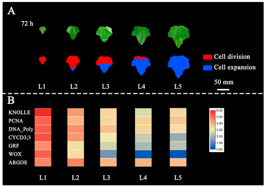 Schematic diagram of changes in the proportion of leaf cells of division and expansion. (A) Leaf cell distribution. The red part represents the area of cell division, while the blue part represents the area of cell expansion. (B) The expressions of marker genes related to cell division. Log2 (TPM+1) is used for heatmap.