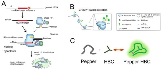 Using RCas9 to target mRNA in living cells. (A) Schematic diagram of RNA imaging system using CRISPR/dCas9 []. The cross symbol represents sequences that do not contain the PAM sequence. (B) Schematic diagram of the CRISPR-Sunspot imaging strategy, depicting the utilization of three target sites within a single mRNA for visualization purposes []. (C) Schematic representation of the Pepper530 complex [].