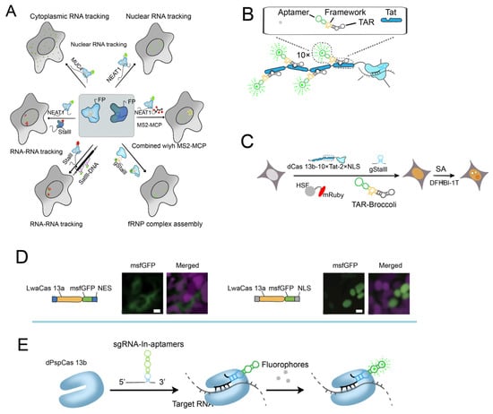 - Tang, H.; Peng, J.; Peng, S.; Wang, Q.; Jiang, X.; Xue, X.; Tao, Y.; Xiang, L.; Ji, Q.; Liu, S.-M.; et al. Live-cell RNA imaging using the CRISPR-dCas13 system with modified sgRNAs appended with fluorescent RNA aptamers. Chem. Sci. 2022, 13, 14032–14040. [Google Scholar] [CrossRef]