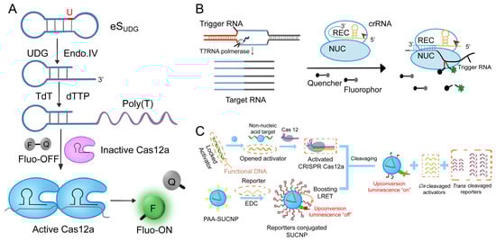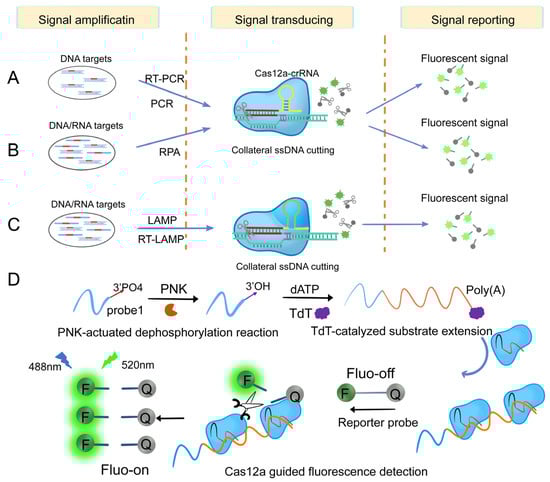 After binding to the target DNA, Cas12a/b releases non-specific ssDNA cleavage activity. This target-induced trans-cleavage activity has been utilized for the detection of DNA molecules []. Li et al., first developed the HOLMES system using this feature for human genotyping, and it can detect DNA and RNA viruses with a 1 aM detection limit within 1 h (Figure 6A) []. Chen et al., developed a detection platform called DETECTR, which allows for the quick and precise detection of human papillomavirus (HPV) at micro-molar levels (Figure 6B) []. Compared to Cas12a, Cas12b has a wider temperature range for trans-cleavage activity. Building upon the HOLMES platform, Wang et al., successfully integrated LAMP with Cas12b trans-cleavage activity, creating a streamlined one-step system. This integration simplifies the detection process, reduces time, and minimizes the instrument requirements, thereby enhancing the overall efficiency and practicality of the system (Figure 6C) []. To further enhance detection sensitivity, Zhang developed a dual amplification sensing method utilizing terminal deoxynucleotidyl transferase (TdT) and CRISPR/Cas12a (Figure 6D). The dual amplification steps led to a synergistic signal amplification effect caused by PNK and can detect PNK activity in cell lysate and screen inhibitors with high selectivity and sensitivity. This method was successfully applied to PNK inhibitor screening and PNK activity detection at the single-cell level [].