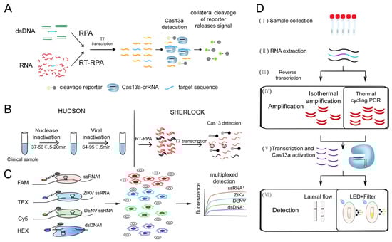 Schematic diagram of nucleic acid detection system based on Cas13. (A) Schematic of ZIKV RNA detection by SHERLOCK []. (B) Schematic of direct viral detection using HUDSON and SHERLOCK []. (C) Overview of Cas13-based CREST modifications []. (D) Schematic of complementary Cas13 and Cas12a enzymes in 4-channel in-sample multiplexing [].