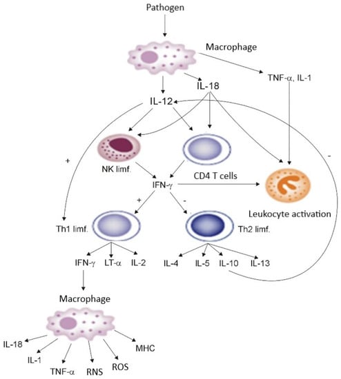 Cytokines are the physiological transmitters of SIRS, and neutrophils, macrophages/monocytes, and endothelial cells are effector cells of this response. Neutrophils, as the first among the professional phagocyting cells, appear at the focus of inflammation a few minutes after the action of an inflammatory stimulus, whereas macrophages appear a few hours later and remain present at the focus of the infection for a longer time. The endogenous mediators of inflammation (including proinflammatory cytokines, reactive oxygen species, eicosanoids, and nitric oxide, among others), which are produced in excess by macrophages and neutrophils in conditions of uncontrolled generalised inflammatory response, injure the host cells. In the early period of the infection, the defensive role of the macrophages consists of phagocyting the microorganisms, in which they are supported by neutrophils. Macrophages are then activated solely by binding with a ligand present on bacteria (lipopolysaccharides) and with other ligands, similarly to neutrophils. At the further stage of SIRS, these cells are a source of cytokines, which, in septicaemia or generally understood injury under conditions of disturbed homeostasis, exert adverse effects on the organism. In complex pathogenesis of SIRS, increasing attention is being paid to the activity of proinflammatory cytokines (TNF-α, IL-1, IL-6, IL-8, IL-12, IL-18) released by activated macrophages, neutrophilic granulocytes, and dendritic cells, and ROS created in the course of “respiratory burst” of neutrophils [19,20,21,37,38]. The phagocyting, dendritic, and vascular endothelial cells, activated by bacterial antigens through TLRs, release many proinflammatory mediators, the excessive expression of which may lead to tissue injury. The released proinflammatory cytokines stimulate white blood cells, mainly macrophages, to produce significant amounts of nitric oxide, through long-term activation of inducible synthase (iNOS). Simultaneous induction of xanthine oxidase and NADPH oxidase, and the created superoxide anion radical O2− causes mast to release cells selectin activators (histamine, thrombin), which facilitate the first contact of leukocytes with endothelial cells and the process of their rolling along the vessels. The simultaneously released adhesion activators, platelet-activating factor (PAF), leukotriene B4 (LTB4), and C5a enable the adhesion of leukocytes to endothelial cells, and then their migration to the location of inflammation [39,40]. The macrophages activated during SIRS also start to secrete TNF-α, IL-1β, IL-12, and IL-18. The last two, in turn, activate T lymphocytes and NK cells, stimulating them to produce IFN-γ, which, together with IL-12 and with the participation of dendritic cells (DC1), induces the differentiation of CD4+ lymphocytes towards the Th1 phenotype, while the Th1 lymphocytes start to produce IFN-γ, IL-2, and lymphotoxin α (LT α). Moreover, INF-γ inhibits the differentiation of CD4+ lymphocytes towards the Th2 phenotype, which could lead to synthesis of IL-4, IL-5, and IL-10 (strong inhibitors of Th1 type cytokines). IFN-γ additionally possesses the properties of activating the bactericidal activity of bacteriophages by inducing the production of TNF-α, ROS, and reactive nitrogen species (RNS) and increasing the expression of MHC antigens. In addition to acting on macrophages, the activation of neutrophils is an additional mechanism through which IFN-γ may protect the body against infection [37,39], whereas the TNF-α and IL-1 generated by activated macrophages are strong activators of neutrophil granulocytes, stimulating them, among others, to a respiratory burst and production of ROS. The described dependencies are shown in Figure 1.
