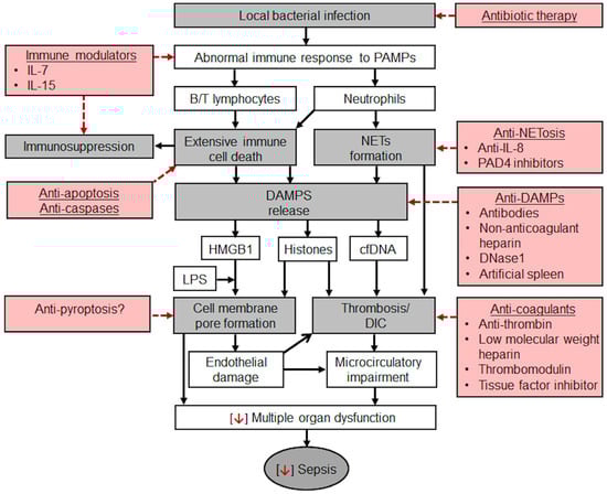 Potential pathological mechanisms of sepsis, which develops from a local bacterial infection, and potential therapeutic strategies. Gray boxes: Pathways from a local infection to sepsis. Once a local bacterial infection causes host abnormal immune responses to pathogen-associated molecular patterns (PAMPs), extensive immune cell death, including B/T lymphocytes (spleen, thymus, lymphoid tissues, and peripheral blood), and neutrophils could occur and result in immunosuppression. Neutrophils could also form NETs. NETs and immune cell death could release a large quantity of DAMPs, mainly HMGB1, cfDNA, and histones. HMGB1 can deliver LPS into cells to trigger pyroptosis by forming pores in the cell membrane. Extracellular histones could also bind to cell membranes to form pores which may cause calcium overload and subsequently endothelial damage and organ injury. Indirectly, extracellular histones activate coagulation to form thrombi in the microvascular lumen to impair microcirculation. cfDNA could serve as scaffolds for thrombosis or stabilize thrombi by increasing their resistance to fibrinolysis. Microcirculatory impairment is the major feature of sepsis and a major contributor to MODS. Red boxes: Potential therapeutic strategies. In addition to early diagnosis, prompt use of effective antibiotics, and supportive therapies, such as maintaining blood pressure and circulation, improving microcirculation, and protecting individual organs, the potential specific therapies include the combination of modulating immune status, preventing immune cell death and NETosis, and neutralizing or clearing DAMPs. These new approaches could become the leading research directions in reducing the mortality rate of sepsis. Source: [124].