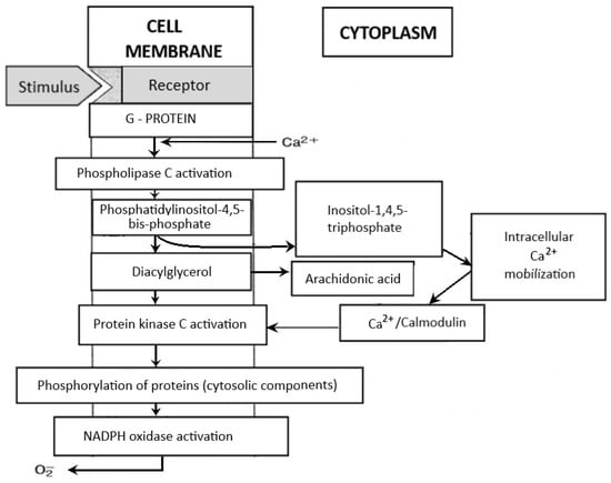 The NADPH oxidase system is capable of transferring electrons from NADPH to oxygen [125,127,128]. The main activators of PKC include intracellular Ca2+ and diacylglycerol, whereas for correct activity of oxidase, such low-molecular-weight proteins as rac2 (present in the cytosol) and rap1A (present in the cellular membrane) are also necessary. The activation of NADPH oxidase may be caused by such factors as TNF-α and other proinflammatory cytokines, bacterial (and also synthetic) N-formyl peptides, phorbol esters, angiotensin II, thrombin, platelet-derived growth factor (PDGF), platelet-activating factor (PAF), LTB4, complement component C5a, and antigen–antibody complexes [125,126,129]. The inhibitors of this enzyme include such substances as secondary lipid peroxidation products (aldehydes), IL-10, nitric oxide, nitrosothiols, and sulfhydryl groups (SH) [130,131,132]. One of the postulated systems for regulating the NADPH oxidase activity is phospholipase D, the activation of which is dependent on calcium ions and dominates in neutrophils subjected to the priming process. In turn, the effect of strengthening the respiratory burst (observed in the primed cells) may result from the activation of MAPK [133,134].