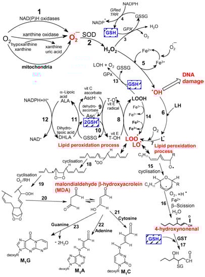 Pathways of ROS formation, the lipid peroxidation process, and the role of glutathione (GSH) and other antioxidants (vitamin E, vitamin C, lipoic acid) in the management of oxidative stress (equations are not balanced). Reaction 1: The superoxide anion radical is formed by the process of reduction of molecular oxygen mediated by NAD(P)H oxidases and xanthine oxidase or nonenzymatically by redox−reactive compounds such as the semiubiquinone compound of the mitochondrial electron transport chain. Reaction 2: Superoxide radical is dismutated by the superoxide dismutase (SOD) to hydrogen peroxide. Reaction 3: Hydrogen peroxide is most efficiently scavenged by the enzyme glutathione peroxidase (GPx) which requires GSH as the electron donor. Reaction 4: The oxidised glutathione (GSSG) is reduced back to GSH by the enzyme glutathione reductase (Gred) which uses NADPH as the electron donor. Reaction 5: Some transition metals (e.g., Fe2+, Cu+, and others) can breakdown hydrogen peroxide to the reactive hydroxyl radical (Fenton reaction). Reaction 6: The hydroxyl radical can abstract an electron from polyunsaturated fatty acid (LH) to give rise to a carbon−centred lipid radical (L•). Reaction 7: The lipid radical (L•) can further interact with molecular oxygen to give a lipid peroxyl radical (LOO•). If the resulting lipid peroxyl radical LOO• is not reduced by antioxidants, the lipid peroxidation process occurs (reactions 18–23 and 15–17). Reaction 8: The lipid peroxyl radical (LOO•) is reduced within the membrane by the reduced form of vitamin E (T-OH) resulting in the formation of a lipid hydroperoxide and a radical of vitamin E (T-O•). Reaction 9: The regeneration of vitamin E by vitamin C: the vitamin E radical (T−O•) is reduced back to vitamin E (T-OH) by ascorbic acid (the physiological form of ascorbate is ascorbate monoanion, AscH−), leaving behind the ascorbyl radical (Asc•−). Reaction 10: The regeneration of vitamin E by GSH: the oxidised vitamin E radical (T−O•) is reduced by GSH. Reaction 11: The oxidised glutathione (GSSG) and the ascorbyl radical (Asc•−) are reduced back to GSH and ascorbate monoanion, AscH−, respectively, by the ad acid (DHLA) which is itself converted to a-lipoic acid (ALA). Reaction 12: The regeneration of DHLA from ALA using NADPH. Reaction 13: Lipid hydroperoxides are reduced to alcohols and dioxygen by GPx using GSH as the electron donor. Lipid peroxidation process: Reaction 14: Lipid hydroperoxides can react fast with Fe2+ to form lipid alkoxyl radicals (LO•), or much slower with Fe3+ to form lipid peroxyl radicals (LOO•). Reaction 15: Lipid alkoxyl radical (LO•) derived, for example, from arachidonic acid undergoes cyclisation reaction to form a six−membered ring hydroperoxide. Reaction 16: Six−membered ring hydroperoxide undergoes further reactions (involving b−scission) to form 4−hydroxy−nonenal. Reaction 17: 4−hydroxynonenal is rendered into an innocuous glutathiyl adduct (GST, glutathione S−transferase). Reaction 18: A peroxyl radical located in the internal position of the fatty acid can react by cyclisation to produce a cyclic peroxide adjacent to a carbon−centred radical. Reaction 19: This radical can then either be reduced to form a hydroperoxide (reaction not shown) or it can undergo a second cyclisation to form a bicyclic peroxide which, after coupling to dioxygen and reduction, yields a molecule structurally analogous to the endoperoxide. Reaction 20: The formed compound is an intermediate product for the production of malondialdehyde. Reactions 21, 22, and 23: Malondialdehyde can react with DNA bases cytosine, adenine, and guanine to form adducts M1C, M1A, and M1G, respectively. Source: [19].