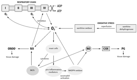 Commonly accepted mechanism of tissue damage in ischemic reperfusion syndrome (involving nitric oxide and neutrophils). Reactive oxygen species (O2−) created in the process of reperfusion cause mast cells to release cytokines, which activate iNOS. The NO formed in these conditions stops the flow of electrons in the respiratory chain and additional production of O2− and peroxynitrite (ONOO−) and prostaglandins (PG), contributing to tissue injury, and the additional gathering of neutrophils and activation of NADPH oxidase intensifies this process. Source: [153].