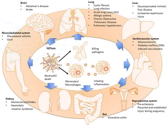 Involvement of NETosis in organ injury. Accumulating evidence now points to an important role of NETosis in infectious and noninfectious solid organ injury. Neutrophil invasion into brain parenchyma and release of neutrophil extracellular traps (NETs) have been established in the pathophysiology of Alzheimer’s disease to cause destruction to neural cells and blood–brain barrier. Abnormal NETosis activity and reactive oxygen species (ROS) response, a key element to NETosis initiation, were observed in stroke patients. The degree of neutrophil infiltration, NET formation/component (e.g., cell-free nucleosomes), and NETosis have been found to correlate with the severity of a range of lung diseases, including cystic fibrosis, acute lung injury (ALI)/acute respiratory distress syndrome (ARDS), and lung infection. NETosis was also shown to be involved in allergic asthma, chronic obstructive pulmonary disease, and pulmonary hypertension, wherein degree of NET formation correlates with disease severity. During liver ischaemia-reperfusion, Toll-like receptor-dependent NET release has been suggested to mediate liver inflammation and injury. Conversely, deficiency in NET release was reported in decompensated cirrhotic liver disease and could explain susceptibility to bacterial peritonitis infection in those patients. NET formation and NETosis have further been implicated in atherosclerosis and myocardial infarction, wherein NET was found in thrombi and infarct lesion and correlated with disease severity. In rheumatoid arthritis, enhanced NET release and NETosis are observed in synovial tissue, rheumatoid nodules, and skin, whilst proinflammatory cytokines and autoantibodies further aggravate neutrophil infiltration and NETosis. Neutrophils could also be potently activated by monosodium urate (MSU) crystals in gout joints and point to a potential role of NET/NETosis in gout pathogenesis. Moreover, neutrophil activation and NET deposition were also observed in colon mucosa of ulcerative colitis. Excessive neutrophil activation, NET formation, and NETosis could also be responsible for different pregnancy-related disorders, including pre-eclampsia, wherein NET deposition and NETosis in the intervillous space may damage maternal endothelium and impair foetal oxygen exchange. Source: [171].