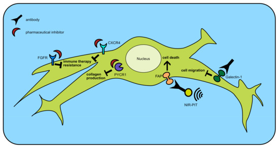 Cancer cells are highly unstable due to frequent gene mutations and differ between patients a lot. Therefore, non-mutated cells like fibroblasts could be an ideal treatment target. Figure 2 gives an overview of the recently developed and below-described therapy options.