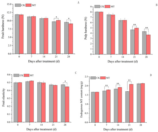 Texture, structure, and endogenous MT content of plum fruits. Values represent the mean ± SE (n = 3). Asterisks indicate significant differences between the treatments using the Student’s t-test (*: 0.01 ≤ p < 0.05; **: p < 0.01). (A): Fruit hardness; (B): pulp hardness; (C): fruit elasticity; (D): endogenous MT content.