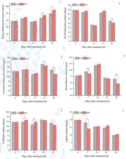 Cell wall substance content in plum fruits. Values represent the mean ± SE (n = 3). Asterisks indicate significant differences between the treatments using the Student’s t-test (*: 0.01 ≤ p < 0.05; **: p < 0.01). (A): Water-soluble pectin content; (B): ion-bound pectin content; (C): covalently-bound pectin content; (D): hemicellulose content; (E): cellulose content; (F): lignin content.