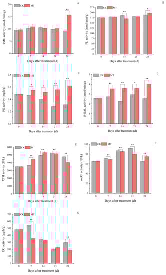 Exogenous MT treatment had no significant effect on the PME activity in plum fruits in the early stage of plum fruit development (Figure 3A). However, at 28 days, the exogenous MT treatment increased the PME activity by 70.76% compared to the control. For the PL activity, exogenous MT treatment significantly decreased its activity at 14 days but increased it at 28 days (Figure 3B). On the contrary, there were no significant differences in the PL activity between the exogenous MT-treated and control plum fruits at 7 and 21 days. The PG and β-GAL activities in exogenous MT-treated plum fruits were higher than the control at 7, 14, 21, and 28 days (Figure 3C,D). Exogenous MT treatment also increased the XTH activity at 7 and 14 days but decreased it at 21 and 28 days (Figure 3E). The α-AF activity in the exogenous MT-treated plum fruits was lower than the control at 7, 14, and 21 days and higher than the control at 28 days (Figure 3F). The EG activity in the exogenous MT treatment fruits was lower than the control at 7 and 28 days, with no significant differences with the control at 14 and 21 days (Figure 3G).