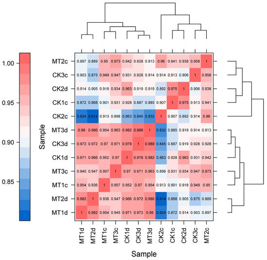 Heatmap of gene expression correlation of samples. CK1c, CK2c, and CK3c represent three replicates of CK at 21 days after treatment. CK1d, CK2d, and CK3d represent three replicates of CK at 28 days after treatment. MT1c, MT2c, and MT3c represent three replicates of MT at 21 days after treatment. MT1d, MT2d, and MT3d represent three replicates of MT at 28 days after treatment.