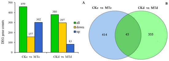 Statistical diagram of DEGs. (A): Number of DEGs; (B): Venn diagram of DEGs. CKc and MTc represent 21 days after treatment. CKd and MTd represent 28 days after treatment.