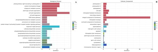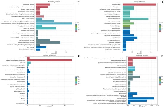 The GO enrichment analyses revealed that 350 DEGs were enriched at 21 days and 306 DEGs at 28 days (Table 3). The DEGs at 21 days were enriched in the biological processes, including photosynthesis, light harvesting in photosystem I, protein-chromophore linkage, xyloglucan metabolic process, xyloglucan metabolic process, chromophore linkage, xyloglucan metabolic process, plant-type cell wall organization, cell wall organization, and cell wall biogenesis (Figure 6A). At 28 days, the DEGs were enriched in photosynthesis, suberin biosynthesis, and lipid metabolic processes (Figure 6D). In the cellular components, the DEGs were enriched in the photosystem I, photosystem II, plastoglobule, and cell wall at 21 days (Figure 6B) and photosystem I reaction center, integral membrane components, and cell wall at 28 days (Figure 6E). In the molecular functions, the DEGs were enriched in chlorophyll-binding, xyloglucan: xyloglucosyl transferase activity, and cellulose synthase (UDP-forming) activity at 21 days (Figure 6C), and the transferase activity, transferring acyl groups other than amino-acyl groups, pectinesterase inhibitor activity, among others, at 28 days (Figure 6F).