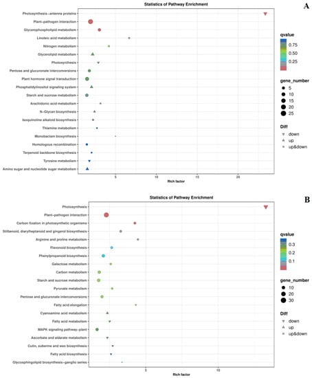 Subsequently, KEGG pathway enrichment analysis detected 302 and 260 DEGs enriched at 21 and 28 days, respectively (Table 3). At 21 days, the DEGs were mainly enriched in the photosynthesis-antenna proteins, plant–pathogen interaction, and glycerophospholipid metabolism pathways (Figure 7A). At 28 days, the DEGs were mainly enriched in photosynthesis and plant–pathogen interactions (Figure 7B).
