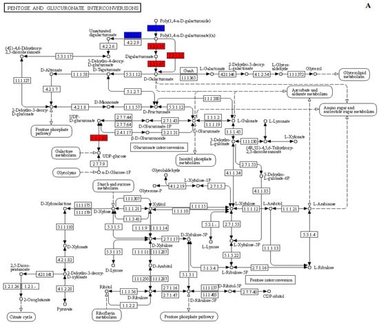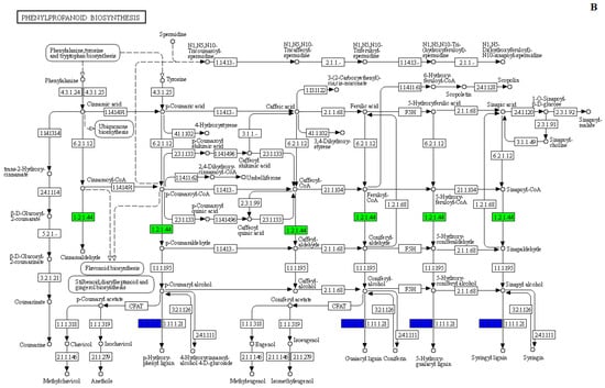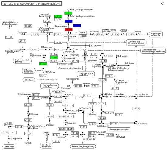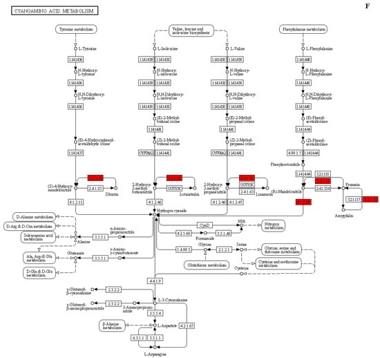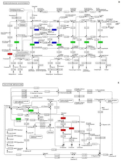 KEGG pathway annotation map of DEGs. (A): DEGs of the pentose and glucuronate interconversions pathway in period c (21 days after treatment); (B): DEGs of the phenylpropanoid biosynthesis pathway in period c (21 days after treatment); (C): DEGs of the pentose and glucuronate interconversions pathway in period d (28 days after treatment); (D): DEGs of the phenylpropanoid biosynthesis pathway in period d (28 days after treatment); (E): DEGs of the cyanoamino acid metabolism pathway in period d (28 days after treatment); (F): DEGs of the galactose metabolism pathway in period d (28 days after treatment). Red represents the up-regulation expressions of genes, green represents down-regulation expressions of genes, and blue represents both up-regulation and down-regulation expressions of genes.