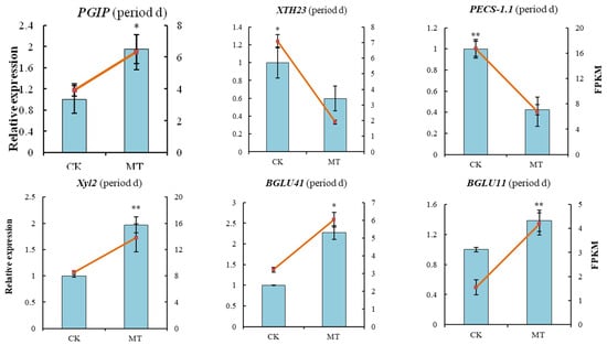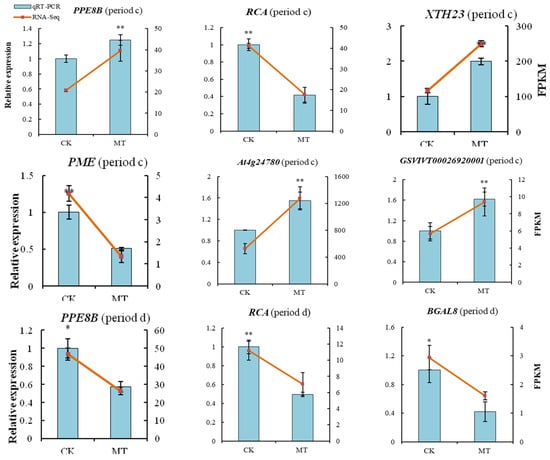 The expression patterns of the six and nine DEGs at 21 and 28 days, respectively, screened by qRT-PCR analysis, were consistent with the RNA-seq results (Figure 9). Notably, PPE8B, XTH23, At4g24780, and GSVIVT0002692001 were up-regulated, and RCA and PME were down-regulated at 21 days post-MT treatment. At 28 days, PGIP, Xyl2, BGLU41, and BGLU11 were up-regulated, and PPE8B, RCA, BGAL8, XTH23, and PECS-1.1 were down-regulated in the MT-treated group.