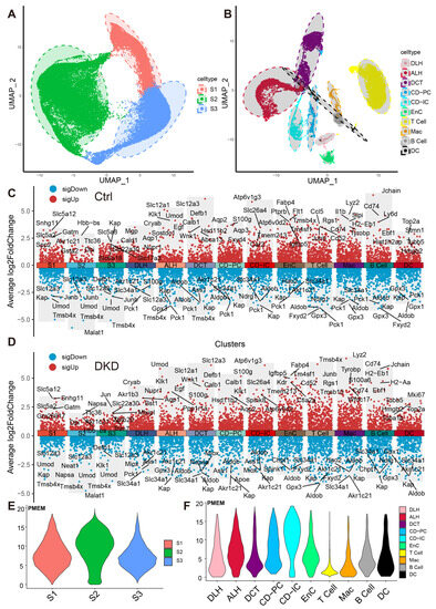 Dimension reduction and mitochondrial content calculation of scRNA-Seq. (A,B) PTCs in S1, S2 and S3 segments of PTCs (A) and DRSC (B), including ALH, CD-IC, CD-PC, DCT, DLH, EnC, T cell, B cell, Mac and DC, are respectively shown in the UMAP map. The accompanying shadows indicate confidence intervals of UMAP score. (C,D) The combined scatter plot shows the respective markers of the 13 renal cell types in the Ctrl (C) and DKD (D) groups. The fold change was obtained by comparing the corresponding cells with the remaining cells except the cells themselves and the five marker genes with the lowest p-value (Wilcox test) in each cell of both up-regulation and down-regulation were labeled. E–F: The PMEM of PTCs (E), DRSC and IC (F) were demonstrated in violin plots with consistent y-coordinates. ALH—Ascending loop of Henle; CD-IC—Collecting duct intercalated cell; CD-PC—Collecting duct principal cell; DCT—Distal convoluted tubule; DLH—Descending loop of Henle; EnC—Endothelial cell; Mac—Macrophage; DC—Dendric cell; PTCs—Proximal tubule cells; S1, S2 and S3 are segments of proximal tubule; PMEM—percentage of mitochondrial encoding mRNA; DRSC—distal renal stromal cells.