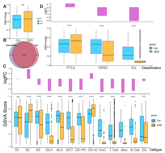 To explore whether the expression pattern encoded by mitochondria was involved in the progress of DKD, we counted the expression of these 13 genes in each cell type (Figure 2E,F, Table S3) and found that the percentages of mitochondrial encoding mRNA (PMEM) in PTCs (S1: 7.89%; S2: 9.51%; S3: 7.29%) and collecting tubules (CD-IC: 10.7%; CD-PC: 7.85%), which were higher than other cells. This might reflect the function of genes in these PTC, CD-IC, and CD-PC cells to transport large amounts of organic and inorganic ions between blood and initial urine. The overall distribution of gene set variation analysis (GSVA) scores between the Ctrl and DKD groups at the whole kidney level (Figure 3A) showed insignificant differences. This phenomenon might be caused by ignoring the heterogeneity among renal cell types. Therefore, we further conducted an analysis of inter-group genetic difference at the levels of whole kidney and PTC. The intersection of the two differential analyses showed that the differential expressed genes in the whole kidney (Wilcox test, p < 0.05|log2(FC)| > 0.5) were nearly identical to those in PTC (Figure 3B). It suggested that previous studies by using bulk RNA-seq in kidney had focused on PTC specifically. Obviously, the comparison of expression at the whole kidney level holds limited significance. We thus performed the analysis of difference between the Ctrl and DKD groups at the cell type level. In the S1 segment of PTCs, there was no significant difference between the groups. In the S2 segment of PTCs, the GSVA score of the mitochondrial coding gene set in the DKD group was significantly higher compared to the Ctrl group, while the GSVA score in the S3 segment of PTCs in the DKD group was significantly lower (Figure 3C). These findings were consistent with the trends in other cell types, except for CD-IC and DC, suggesting that PTCs were less affected by DKD than distal renal stromal cells (DRSC) and immune cells (ICs). Therefore, we re-counted the GSVA score of these cells at levels of PTCs, DRSC and ICs. In the different classifications, compared to the Ctrl group, GSVA score in PTCs of the DKD group was higher, while the GSVA score in DSRC and ICs were lower, and the downscaling multiples in ICs were larger and more significant (Figure 3D).