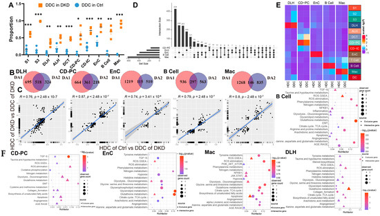 Cells of the DKD group can be divided into two distinct clusters by the clustering of mitochondria-related gene sets. (A) Boxplot showing the distribution in DKD-dominance clusters among cell types of the Ctrl group (skyblue) and DKD group (orange). P, unpaired t test. * p < 0.05, ** p < 0.01, *** p < 0.001. (B) Venn diagram showing the difference (p < 0.05 and |log2(fold change)| > 0.5) between HDC in the Ctrl (DA1) and DKD (DA2) groups and DDC. (C) The linear relationship of the log2 (fold change) of intersected genes in (C) was fitted by Pearson correlation coefficient. (D) High latitude Venn diagrams of DA2 unique genes among DLH, CD-PC, EnC, B cells, Mac. (E) The correlation between sub-cell types and their original cell types is displayed by complex heatmap. (F) Bubble diagram of conventional DKD-related pathway enrichment analysis of diff2-exclutive genes (Blue area), intersective genes (Purple area) of DA1 and DA2 in Figure 3C. The top 20 pathways (if sufficient) were selected by p-value (<0.05).