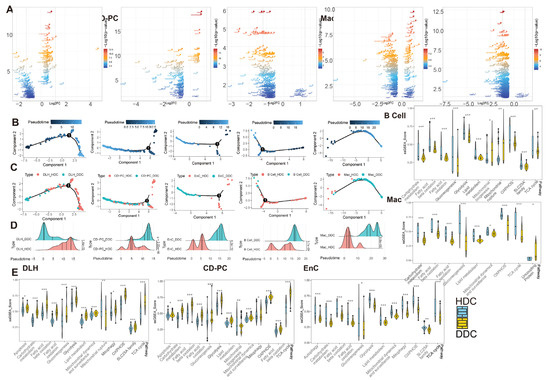 The pseudotime analysis of ESDEG and mitochondria-related DKD pathways demonstrated that HDCs and DDCs were significantly different in cell state. (A) The volcano diagram shows the differences of exclusive genes (The blue area in Figure 3C) between DDCs and HDCs in DLH, CD-PC, EnC, B cells, Mac, where the abscess represents the difference fold and the ordinate represents the significance (Q value < 0.05, |log2(Fold Change)| > 0.5). (B,C) The scatter plot shows the pseudotime distribution trajectory (B) obtained by semi-supervised learning in monocle2 and the coordinates (C) of HDCs and DDCs in each cell in the pseudotime. (D) The cumulative density distribution curves show that HDCs and DDCs have significant differences in the pseudotime distribution of their respective cells (t test). (E) The gene set enrichment analysis (ssGSEA) score of DKD-related mitochondrial pathways related to mitochondrial damage in DKD is demonstrated in HDCs and DDCs, and the difference analysis was performed by generalized linear models in the limma package. (*, p-value < 0.05; **, p-value < 0.01; ***, p-value < 0.001).