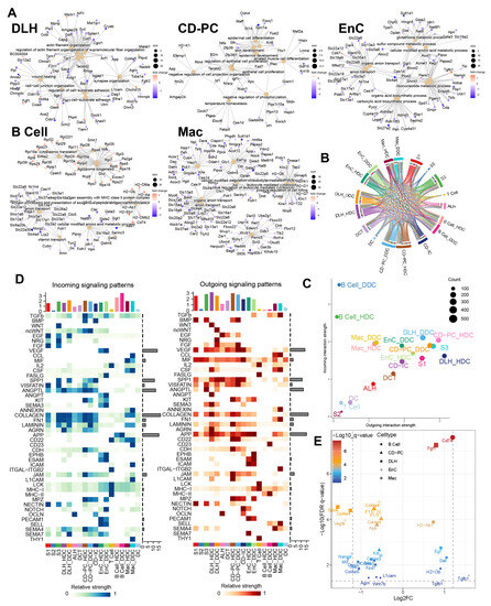 Gene ontology enrichment analysis of ESDEGs and prediction of the cell communication pathway. (A) Gene ontology enrichment analysis (based on the principle of hypergeometric distribution) network diagram of ESDEGs produced by clusterProfiler and CNBplot. The color of the outer dot represents the foldchange of ESDEGs in DDCs compared to that in HDCs, while the size of the inner dot represents the number of genes enriched into this pathway. (B) Comprehensive cell communication of each cell type in the DKD group was obtained by Cellchat package calculation and its built-in ligand-receptor information. The color of the string represents the type of cell from which the communication pathway originated, and the length of the arc represents the number of cells involved in the corresponding pathway. (C) Each cell type in the DKD group was involved in the incoming and outgoing cell communication to varying degrees. The size of the bubble represents the actual number of cells involved in communication. (D) The two heat maps respectively showed the relative strength of 46 incoming (left) and outgoing (right) cell interactions of each cell type in the DKD group. The bar chart at the top showed the total relative strength of the corresponding cell type in each of the 46 signaling pathways. (E) The volcano diagram showed the q value and fold change of ESDEGs as ligand or receptor for DDCs of B cells, CD-PC, DLH, EnCs and Mac compared to HDCs included in cell communication pathways.