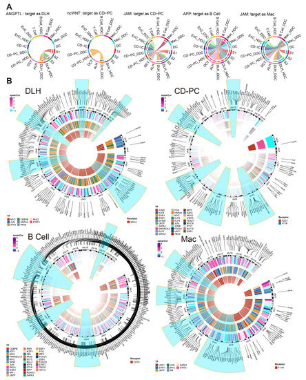 Incoming cell communication pathways, including ESDEGs between DDCs and HDCs of DLH, CD-PC, B cells and Mac, which regulate downstream TF and TG. (A) Chords of five incoming cell communication pathways containing corresponding cell receptors as ESDEGs. The color of the string represents the type of cell from which the communication pathway originated, and the length of the arc represents the number of cells involved in the corresponding pathway. (B) The three-layer ring heat map shows the co-expression coefficient (Spearman) between target gene and transcription factor, transcription factor and receptor from the outside to the inside. The outermost content marks the location of ESDEGs in the mouse genome, and the five chromosomes that contain the most ESDEGs are highlighted in blue (if sufficient).