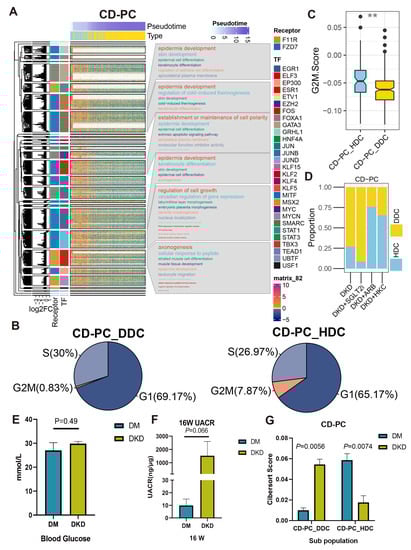 The cascaded regulatory network of receptors, TF and TG resulted in the regulation of specific KEGG pathways and cell state of HDCs and DDCs. (A) The complex heat map showed the distribution of HDCs and DDCs of CD-PC as well as the expression of ESDEG with the progression of pseudotime. The four columns of left annotation from left to right are kmean clustering tree, the fold change of ESDEG to HDC in DDC, receptor and TF, respectively. More than 50 genes belonging to the same transcription factor will be enabled for KEGG enrichment analysis and shown in the word cloud annotation on the right. (B) Pie charts of cell cycle distribution of two subpopulations of CD-PC in the DKD group. The G2M phase cells of CD-PC_HDC were significantly higher than those of CD-PC_DDC. (C) The G2M score calculated by cell cycle signatures was significantly higher in CD-PC_HDC than in CD-PC_DDC. The S-phase score calculated by cell cycle signatures was significantly higher in B cell_DDC than in B cell_HDC. (**, p < 0.01, t test). (D) The distribution of HDCs and DDCs in B cells in the ARB, SGLT2i and HKC groups was predicted by singleR. (E,F) At the 16th week, db/db mice were used to measure BG (E) and UACR (F). Mice with high BG (>16.7 mmol/L) but no proteinuria (UACR < 30 ng/μg) were divided into the DM group, and mice with high blood glucose (BG) and proteinuria (UACR > 30 ng/μg) were divided into the DKD group. (G) Cibersort score of HDCs and DDCs of CD-PC inferred by TPM value of bulk RNA-Seq.