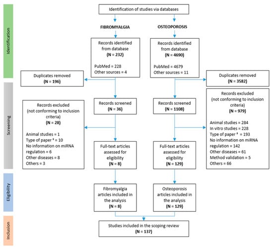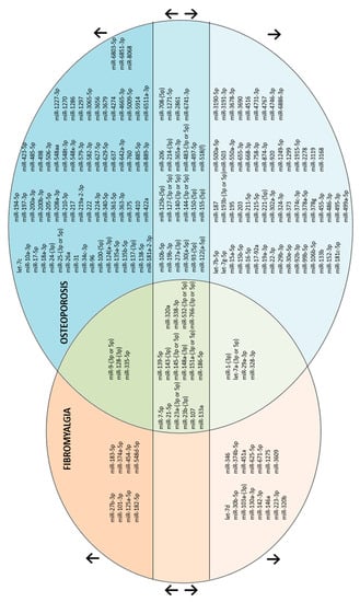 Low BMD and OP have been shown to be linked to FM [1,13,14,15,16,17]. In order to better characterize the association between both pathologies, the aim of this review was to identify if there are miRNAs common to FM and OP. It also aimed to specify which miRNAs are regulated in the same direction, and to suggest common biomarkers.