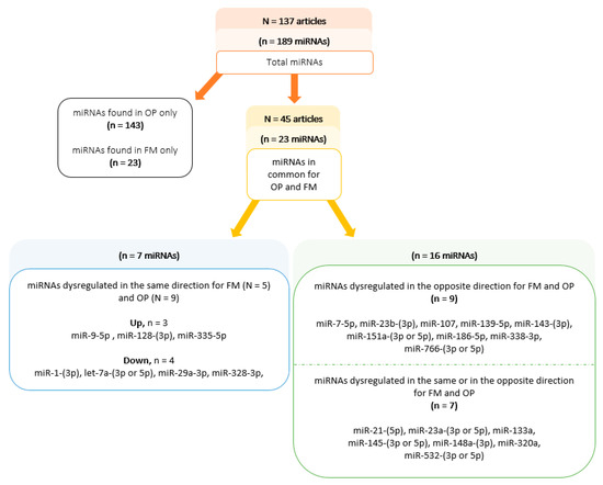 In 45/137 articles, 23 miRNAs were common for FM and OP (Figure 2, Table 1): 14 articles showing 7 common miRNAs dysregulated in the same direction, and 40 articles showing 16 miRNAs dysregulated in the opposite direction (n = 9) or discordant (n = 7 dysregulated in the same or in the opposite direction in FM and OP).