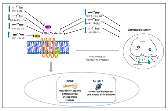 A total of 23 common miRNAs were retrieved in the literature. Fifteen of these are described to target and modulate the Wingless integration site (Wnt) pathway (miR-1-(3p), let-7a-(3p or 5p), miR-9-(3p or 5p), miR-21-5p, miR-29a-3p, miR-107, miR-133a, miR-139-5p, miR-145-(3p or 5p), miR-148a-(3p), miR-186-5p, miR-320a, miR-328-3p, miR-335-5p, and miR-338-3p) [164,165,166,167]. Seven miRNAs modulate the cholinergic system (miR-7-5p, miR-9-(3p or 5p), miR-128-(3p), miR-148a-(3p), miR-186-5p, miR-328-3p, and miR-532-(3p or 5p)), known as “CholinomiR” [30,168]. It is interesting to note that three miRNAs are upregulated and four downregulated in FM and in OP, and they target the Wnt pathway in bone studies, and the cholinergic system in FM studies.