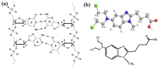 Deoxyribonucleic acid (DNA) is the coding molecule used to store, transmit, and express genetic information and is one of the main targets of drug therapy [1]. As shown in Figure 1a, DNA strands are composed of several deoxyribonucleotides polymerized by 3′→5′ phosphodiester bonds, with a basic backbone formed by alternating deoxyribose and phosphate connections on the outer side and four kinds of bases (adenine, guanine, cytosine, and thymine) on the inner side. The bases between the two chains are connected by hydrogen bonds to form base pairs [2]. Drug molecules can affect or damage the structure of DNA through different pathways, which in turn directly or indirectly impede the normal DNA replication, transcription, and other processes, and eventually cause apoptosis to exert anti-tumor effects [3,4]. It has been shown that drugs that interact with DNA in vivo can also act in vitro [5]. Therefore, the interaction between DNA and drugs can be studied in vitro to predict the mechanism of action of both occurring in vivo. At this stage of research, researchers prefer to use calf thymus DNA rather than human DNA for their experiments because ctDNA is a natural, high-quality dsDNA template from a mammalian source that is widely available, easy, and inexpensive to source [6] and thus ctDNA is widely used for drug–DNA interaction spectroscopy, polymerase analysis, and other biomolecular experiments [7]. Therefore, in order to better explore the correlation between anticancer activity and structure, it is particularly important to understand the interaction properties of DNA and ligands [8], At the same time, it provides a new idea for designing a hybrid nanomaterials drug delivery system based on DNA structure [9].