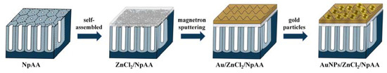 - The NpAA substrate was prepared by the standard two-step anodic oxidation method [26,27]. Add electrolyte into the self-made glass tank and put a magnet for magnetic stirring, place the glass tank in the low-temperature cooling tank, connect the external 40 V voltage regulator power supply, set the temperature of the low-temperature tank to 0 °C during anodic oxidation, the electrolyte added in the glass tank is 0.3 mol/L oxalic acid solution, the first oxidation time is 1 h, the second oxidation time is adjusted to 2 h;