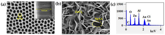 The surface morphologies of the prepared NpAA and ZnCl2/NpAA were characterized by scanning electron microscopy (SEM), as shown in Figure 3a,b, respectively. As can be seen from Figure 3a, there are tightly connected, ordered, and uniform primitive nanopore structures on the substrate, which are closely aligned with hexagonal cells. The pore size is relatively uniform, maintaining between 80 and 90 nm. The illustration at the top right shows a cross-section of the substrate, with the nanopore channels at the bottom of the vertical clearly visible, with channel lengths remaining between 5.5 and 6 microns. In the preparation process, the aperture can be controlled by changing the type of electrolyte and the reaction time.
